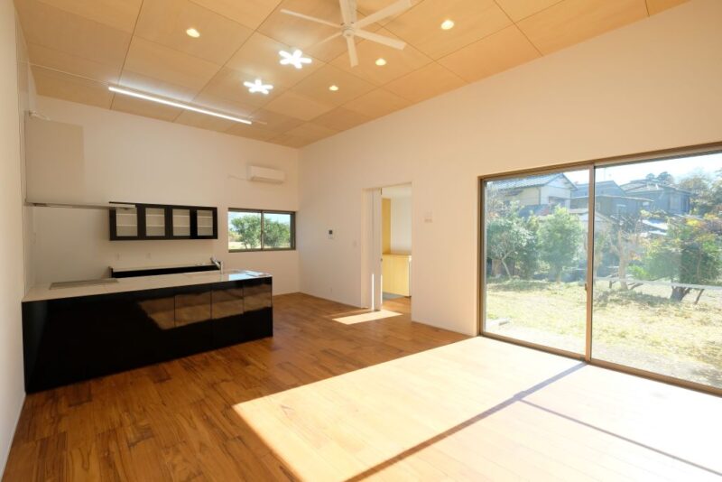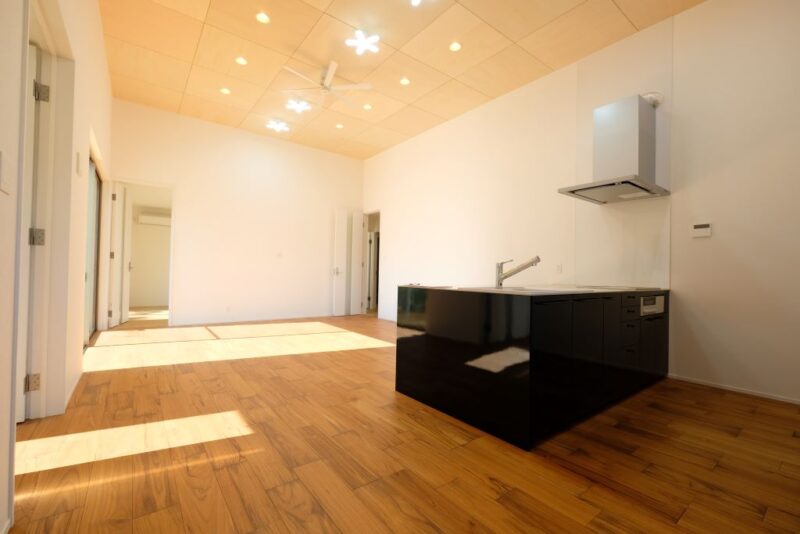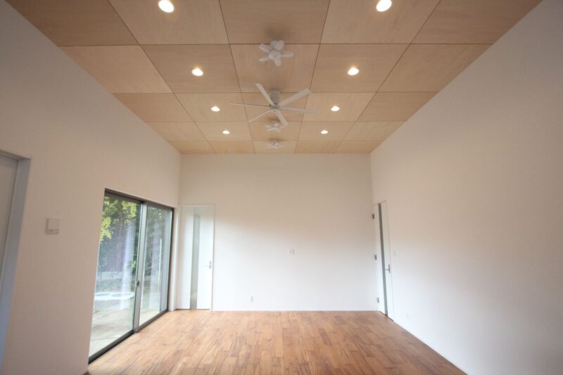 LDK  天井高3.5m シナ合板市松張り